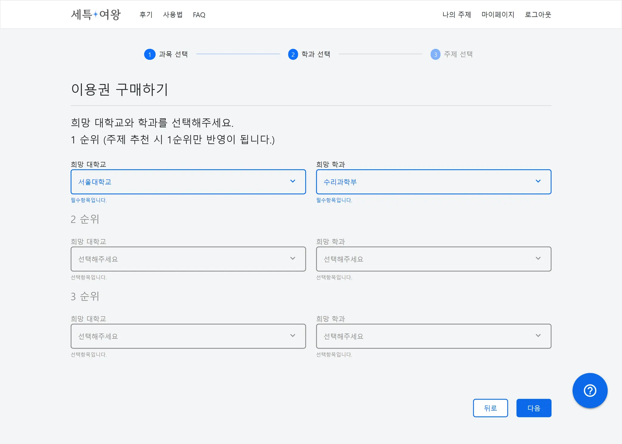 희망 대학교와 학과를 선택합니다. (3순위까지 등록 가능)
