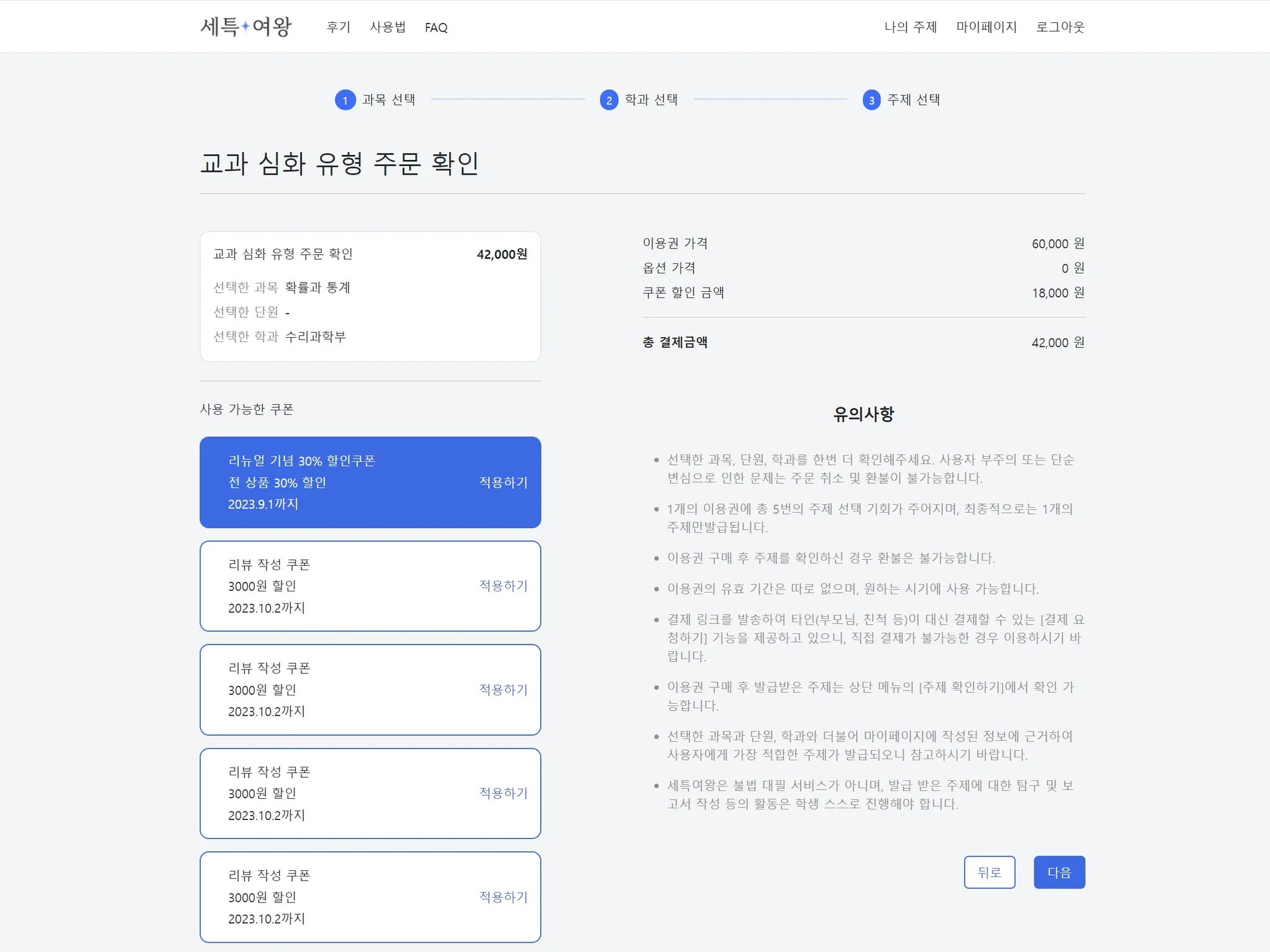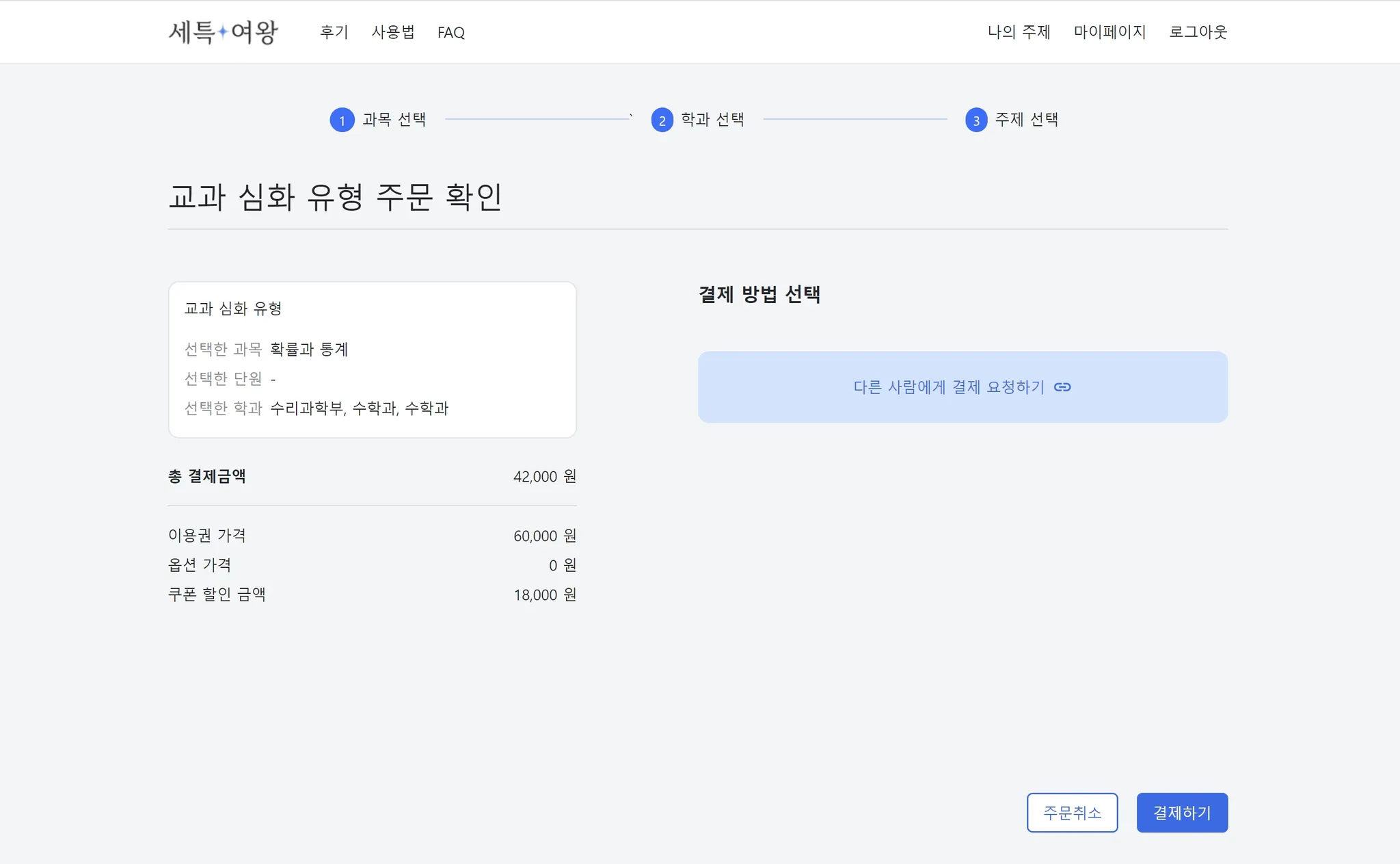 주문 내역을 확인합니다. (주제 유형, 선택한 과목/단원/학과)