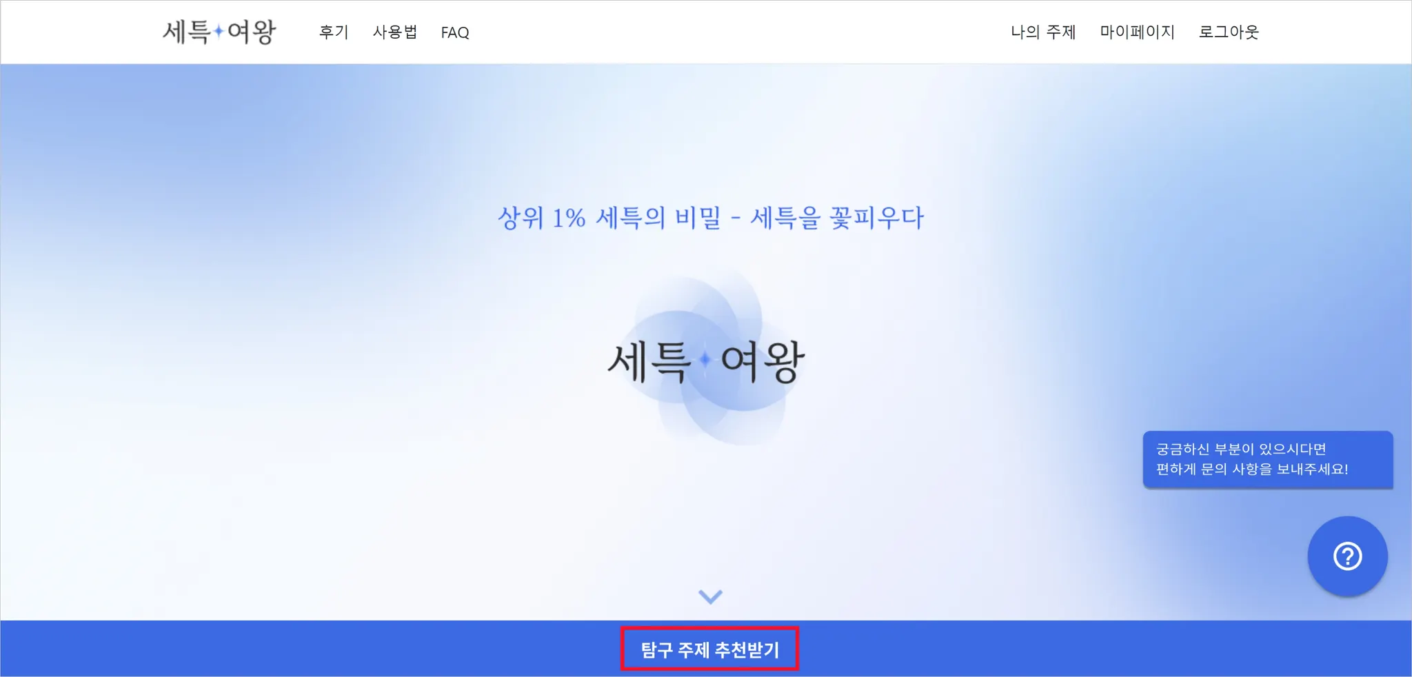 로그인 후, 페이지 하단 배너의 ‘탐구 주제 추천받기’를 클릭합니다.