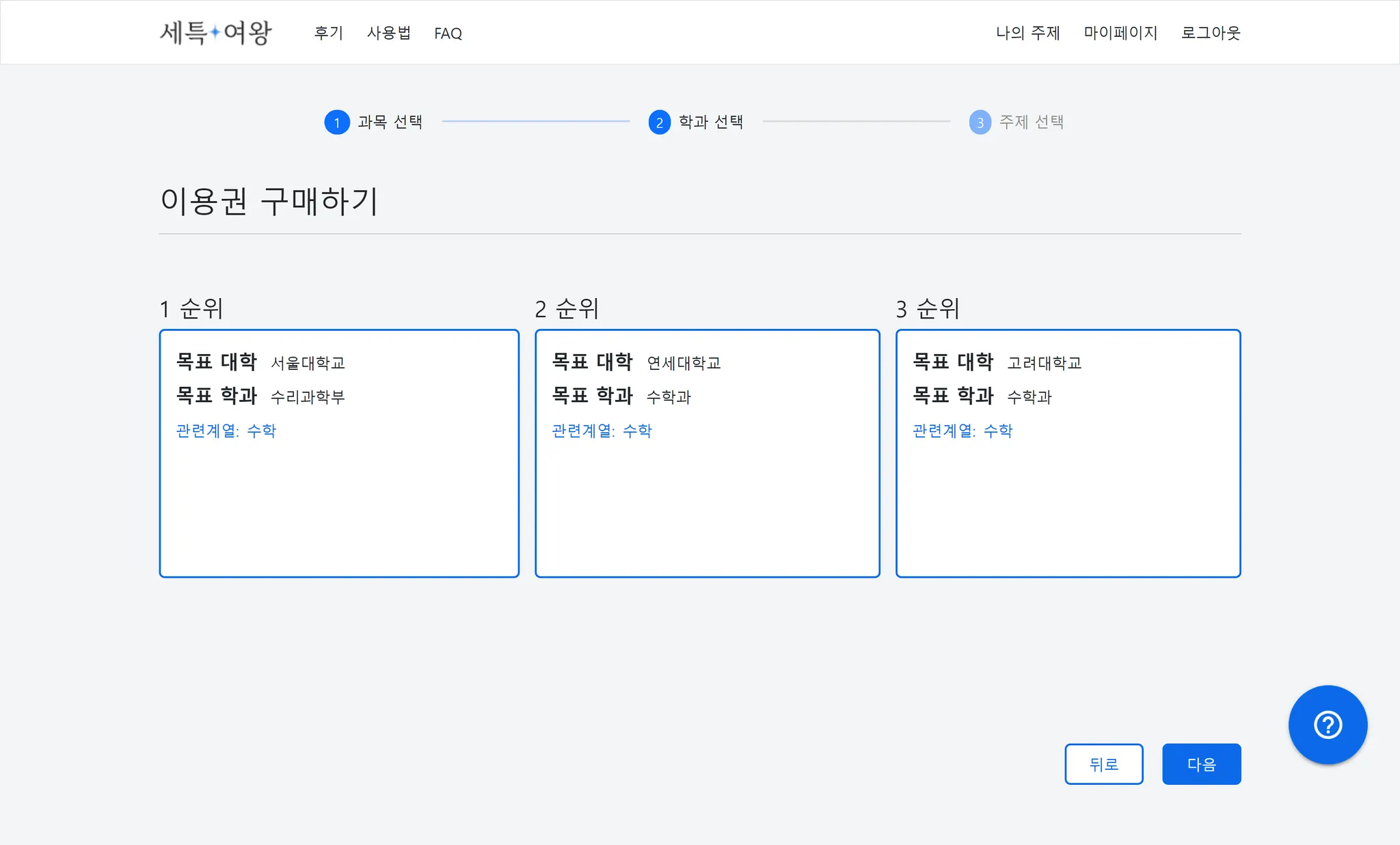 등록한 목표 대학/학과를 확인한 후 다음 버튼을 클릭합니다.