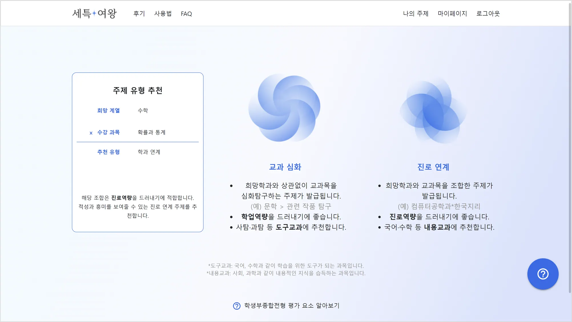 세특여왕 AI가 주제 유형을 추천해 줍니다. (화면 왼쪽 박스)