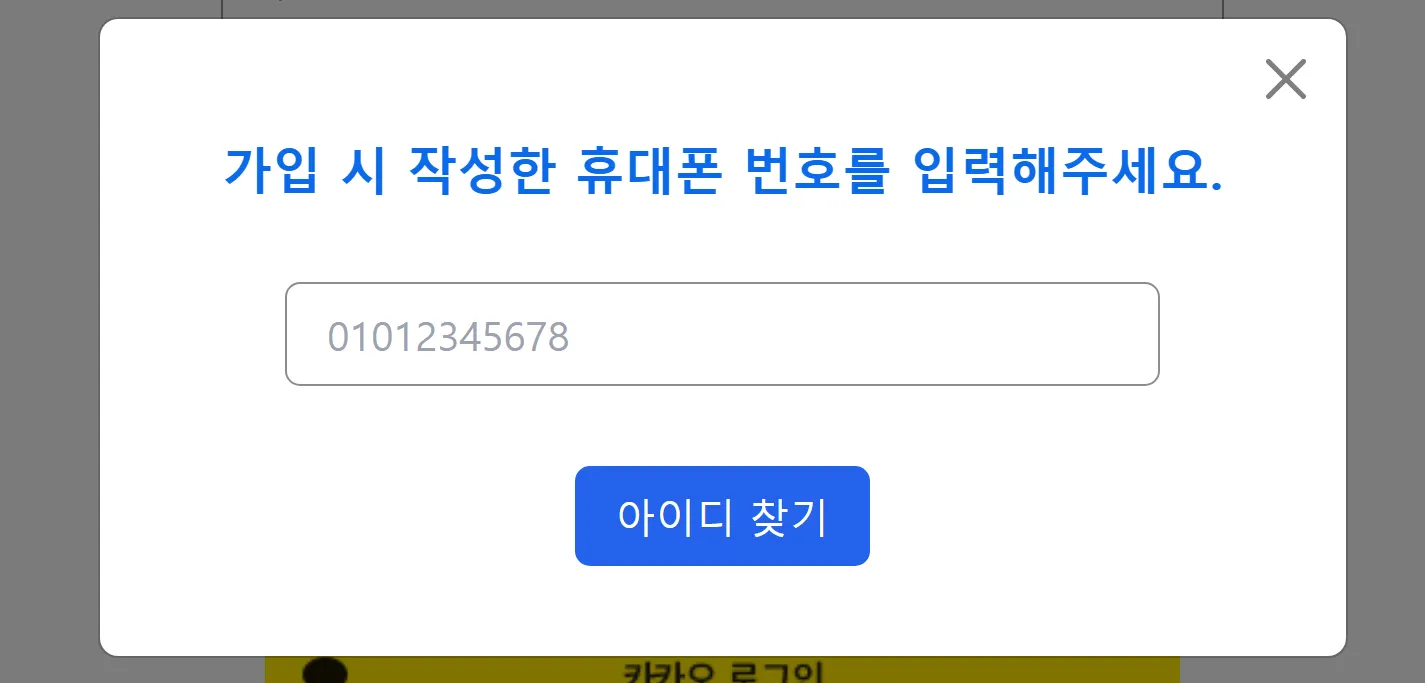 아이디 찾기 를 클릭하면 팝업창이 노출됩니다.